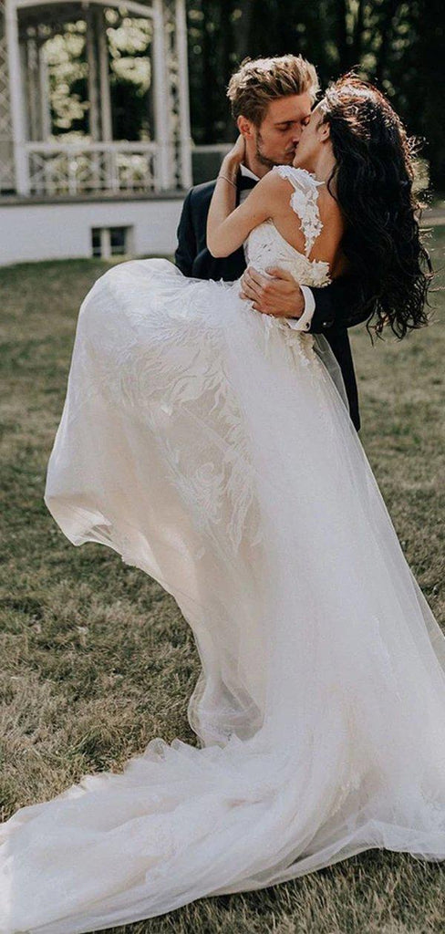 Vintage A-line Off the Shoulder Lace Romantic Long Wedding Dresses, WD0612