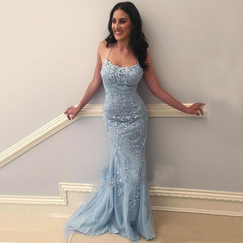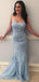 Spaghetti Straps Blue Spaghetti Straps Lace Mermaid Prom Dresses, PD2387