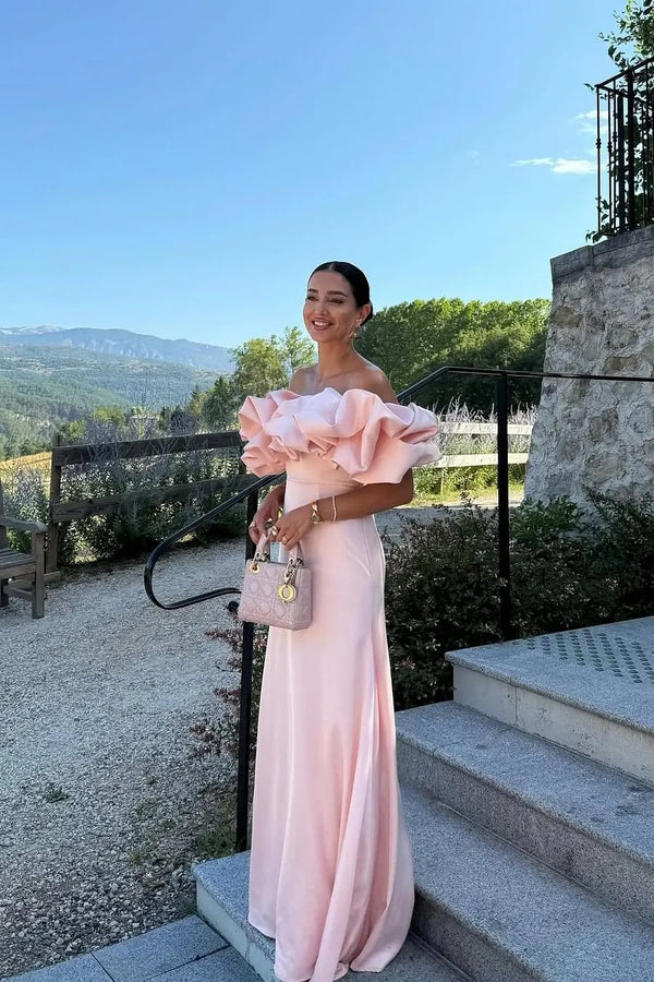Sweet Satin Off Shoulder Sleeveless Mermaid Maxi Prom Dress with Ruffles, PD4045