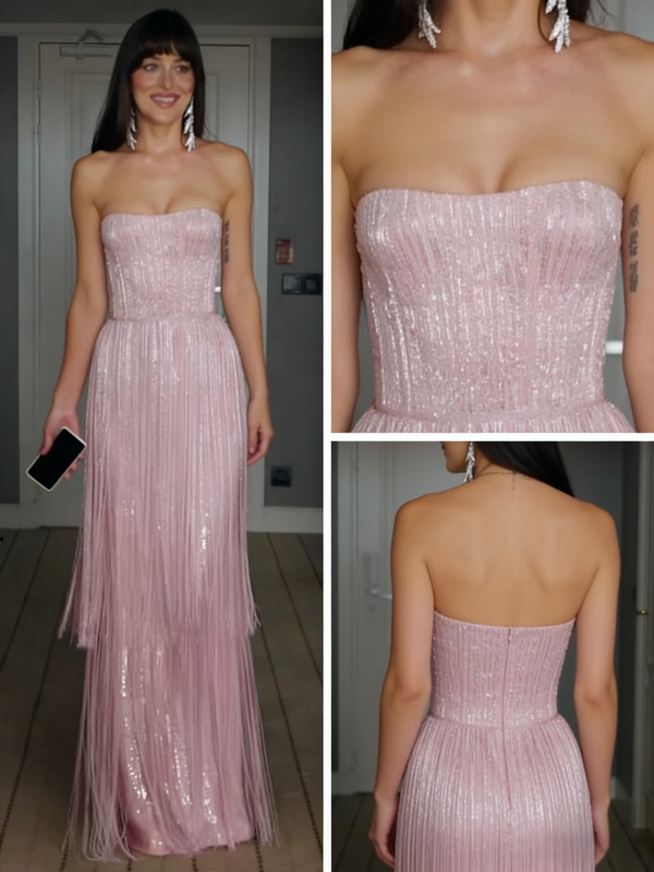 Blush Fringe Sequin Prom Dress | Strapless Red Carpet Style Evening Gown, PD4147