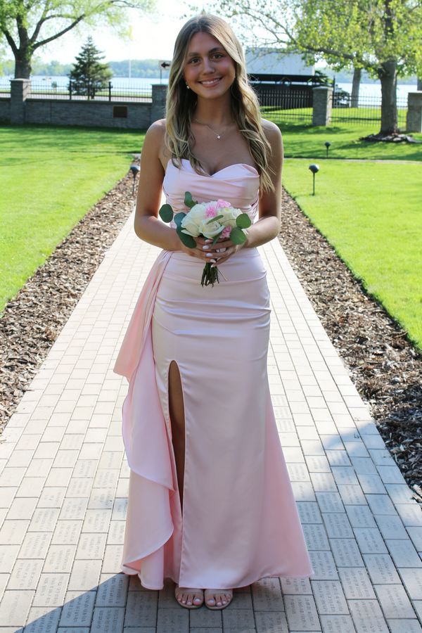 Blush Pink Satin Strapless Prom Dress with High Slit and Draped Detail, PD4122