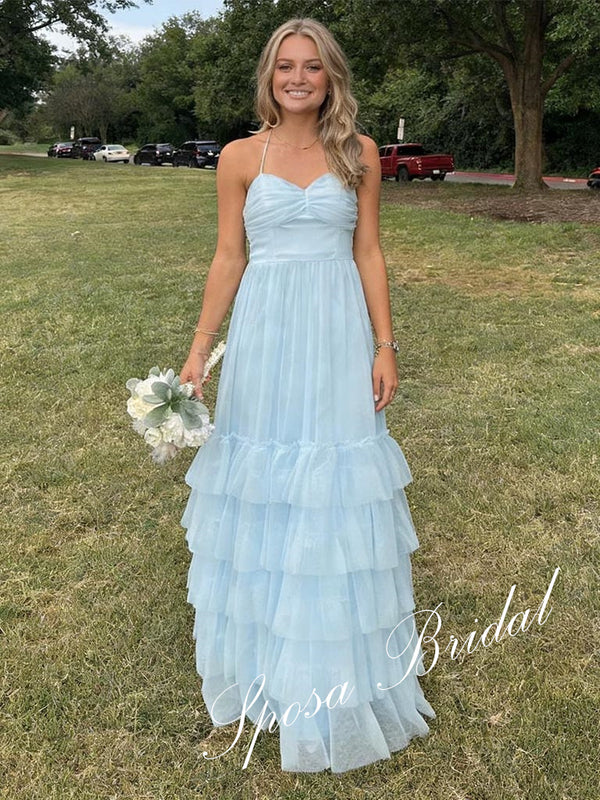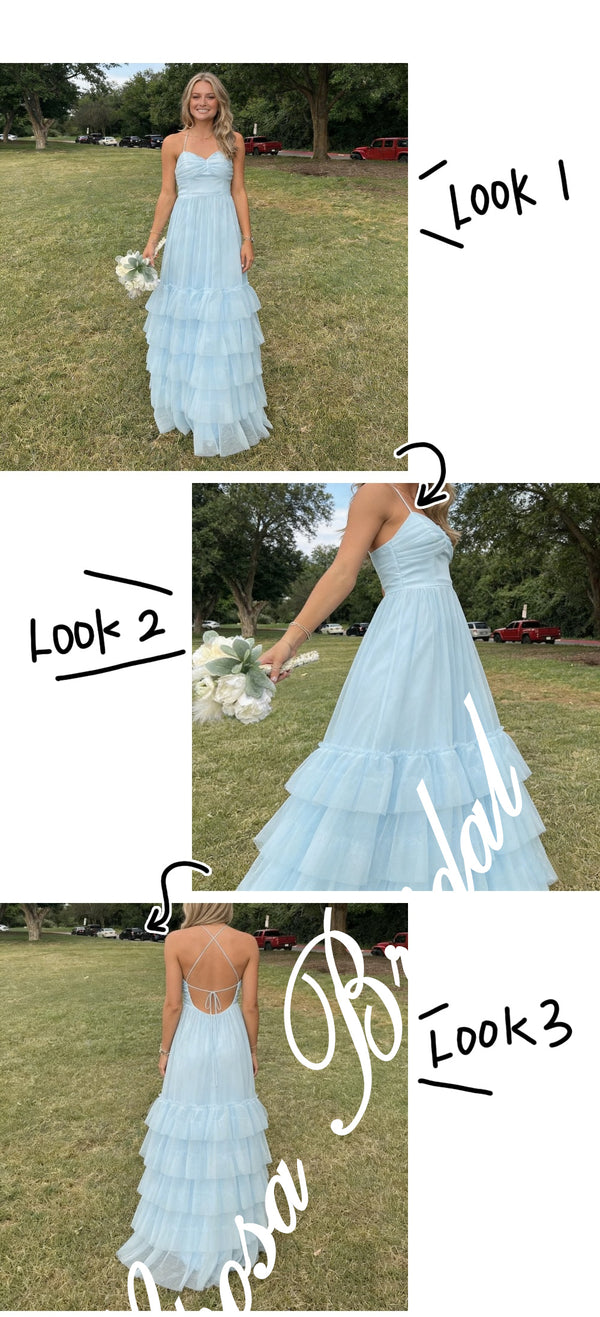 Elegant Chiffon Spaghetti Straps Ruffled Criss Cross A-Line Floor Length Prom Dress, PD4089